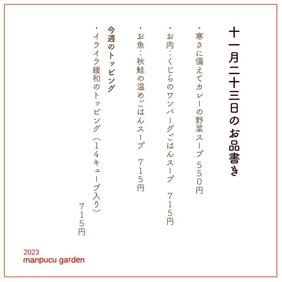 オーガニックトマト缶、じゃがいも、かぼちゃ、冬瓜、赤蕪、大根、ごぼう、人参、春菊、セロリ、カリフラワー、小松菜、しいたけ、柿、パクチー(生)