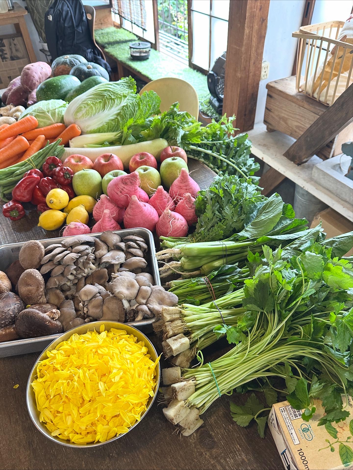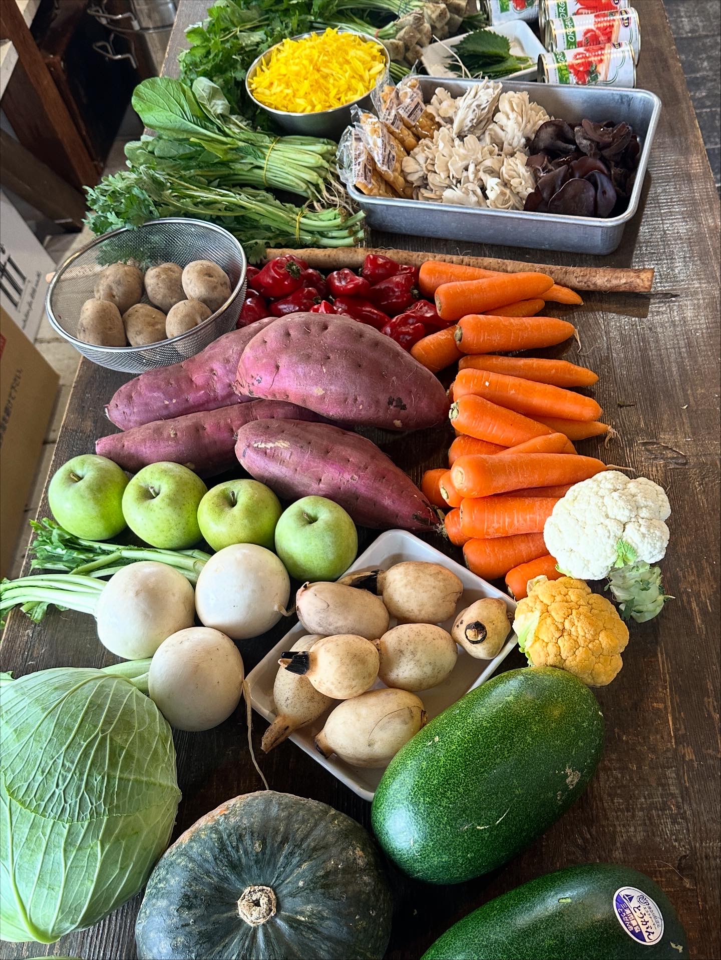有機トマト缶、キャベツ、冬瓜、さつまいも、蓮根、小松菜、カリフラワー、人参、赤ピーマン、りんご、舞茸、三つ葉、菊の花、パクチー(生)