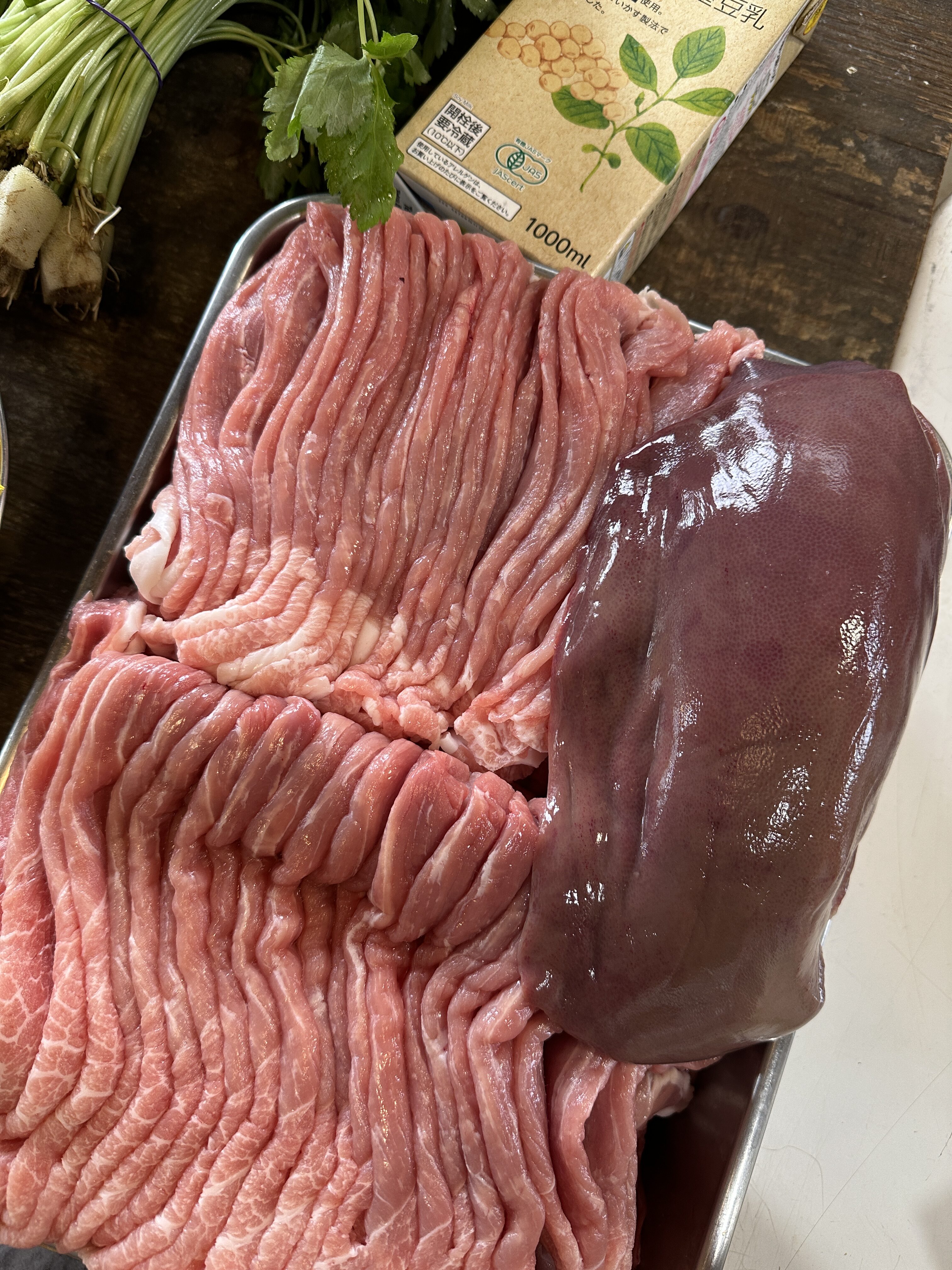 夏の暑さに負けじと頑張った心臓へのご褒美的に、いつもより脂質高め(といってもそんな全体の10%前後ですが)のモモ肉を豆乳と本葛で煮込みます。