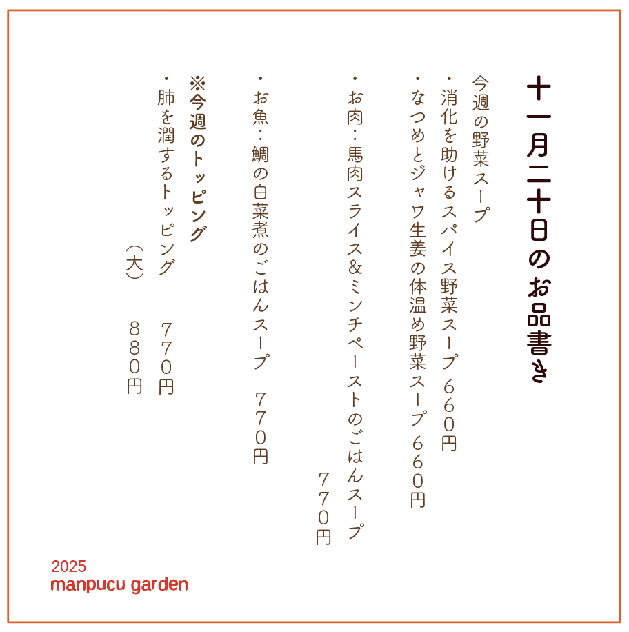 キャベツ、もち菜、赤かぶ、かぼちゃ、人参、青パパイヤ、冬瓜、小松菜、赤水菜、りんご、舞茸、木耳、菊の花、パクチー(生)