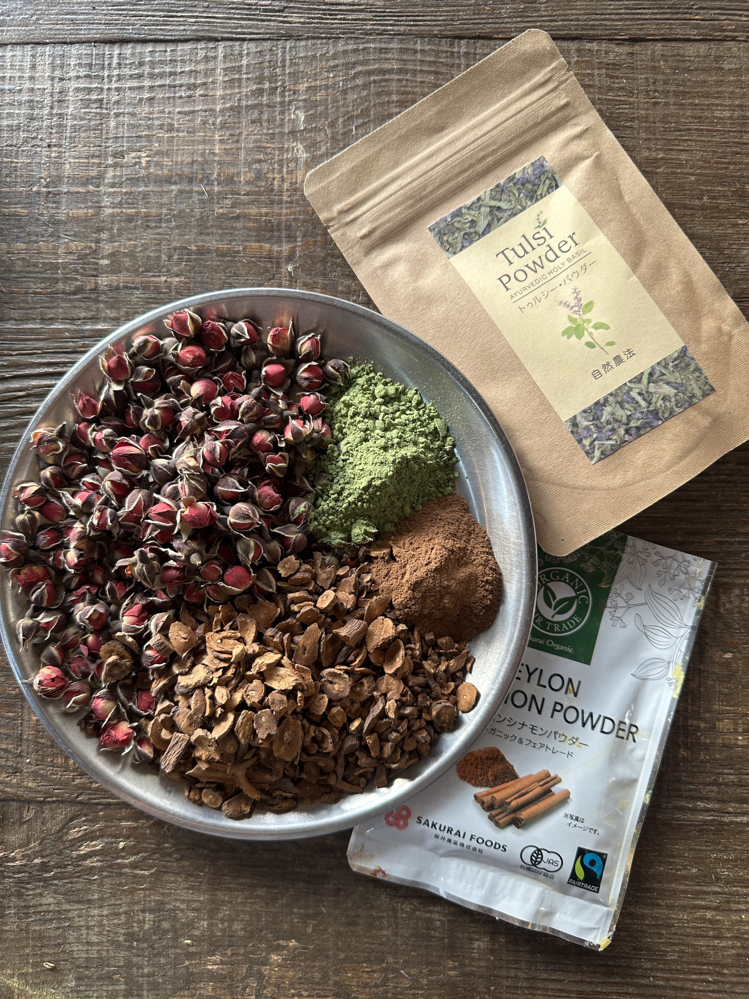 昆布水+マイカイカ(薔薇のつぼみ)、ダンディライオン、マルベリー、セイロンシナモン(