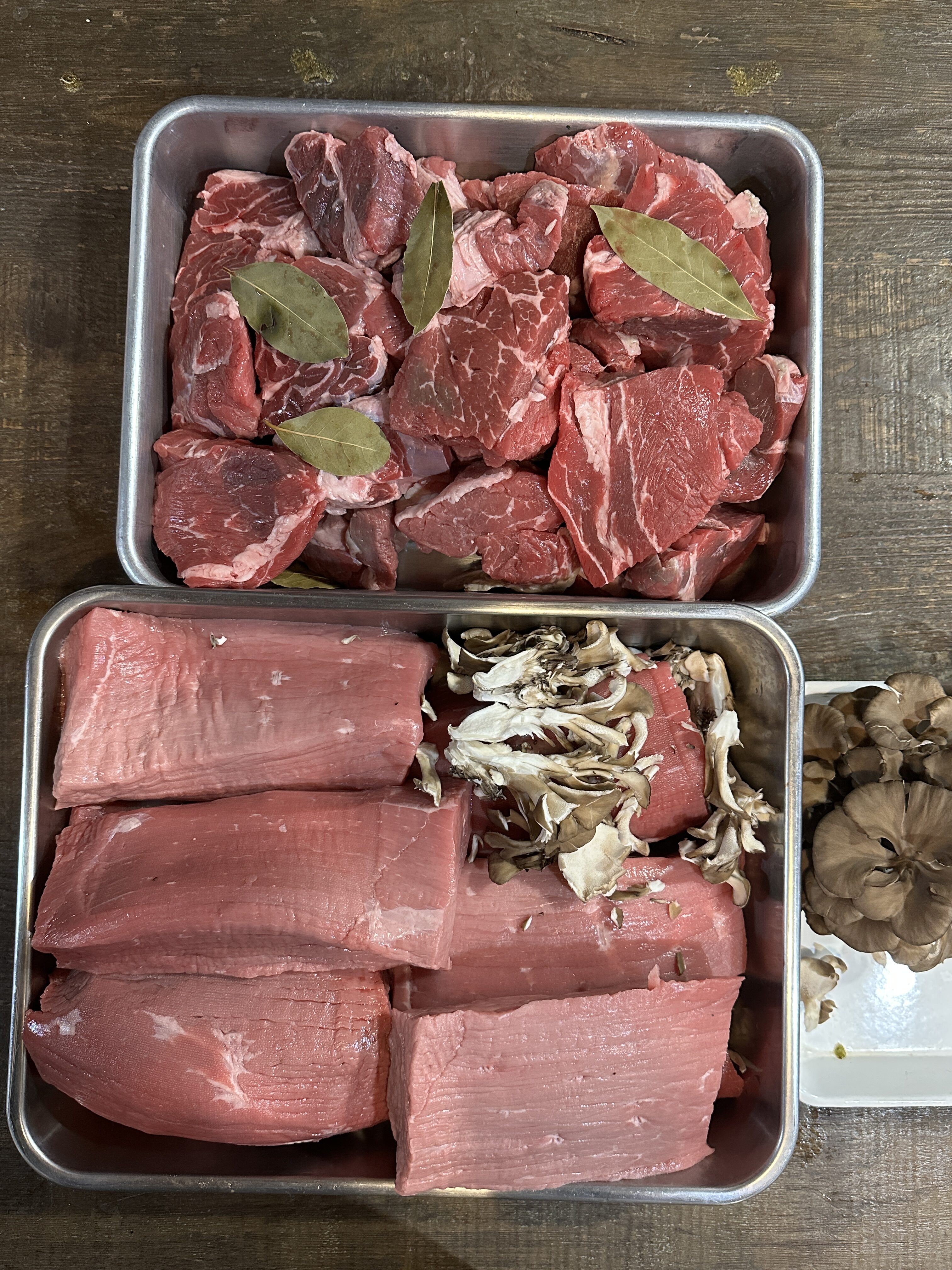 オージービーフモモ肉(45g)+牛すね肉(30g)+パプリカ粉+八角+昆布水