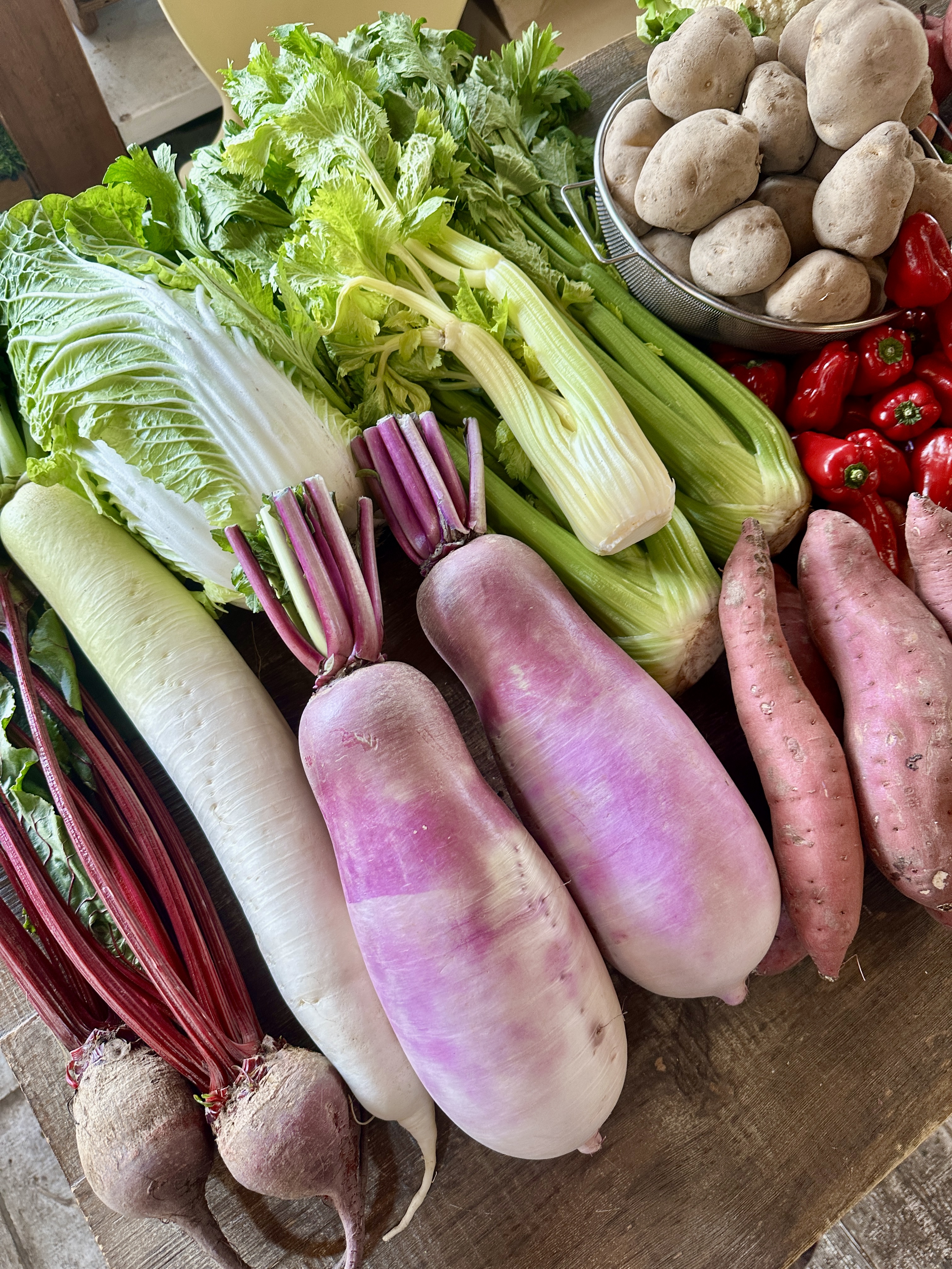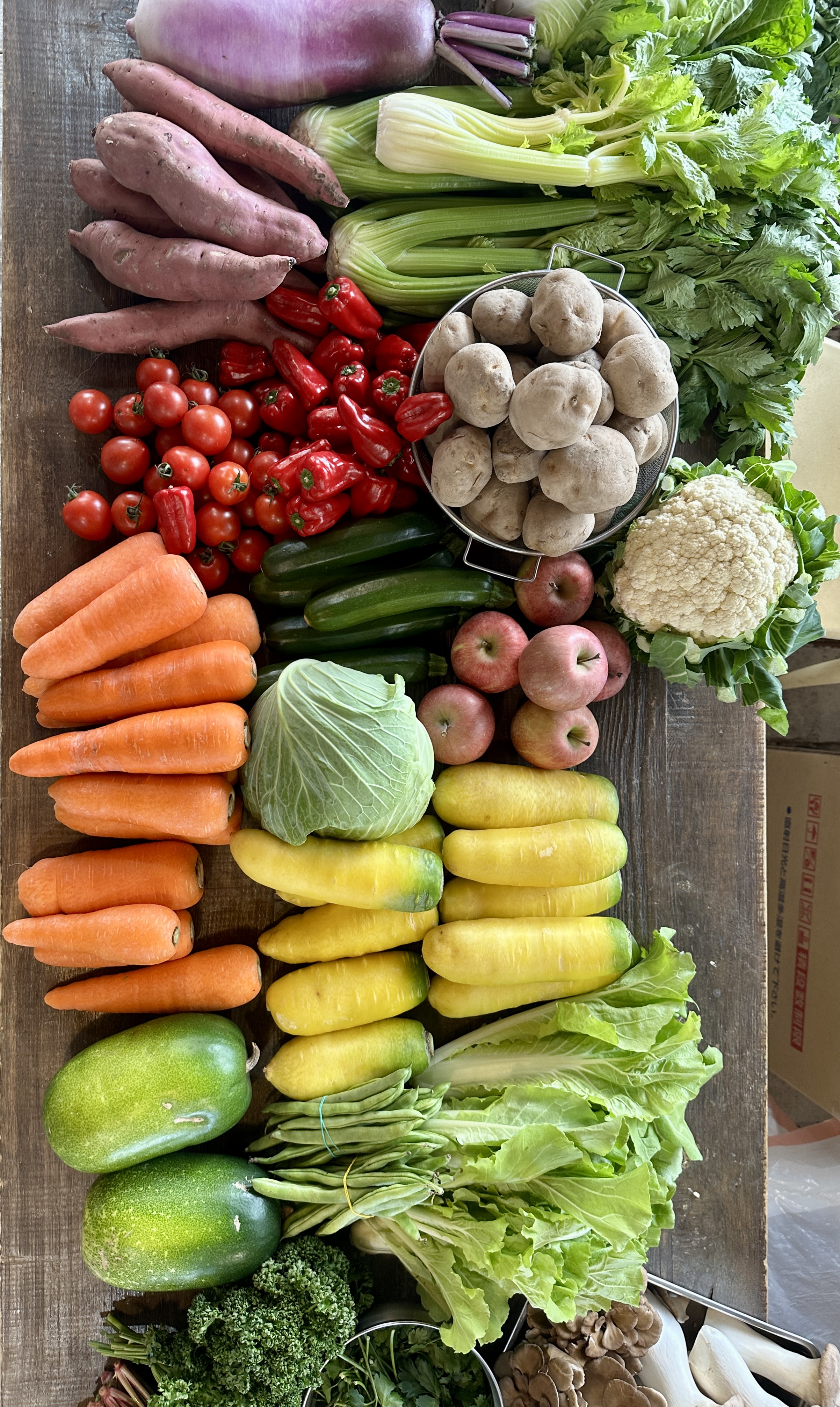 さつまいも、人参、白菜、ケール、蓮根、聖護院大根、春菊、小松菜、菊芋、モロッコいんげん、りんご、なめこ、エリンギ、りんご、金柑、三つ葉(生)