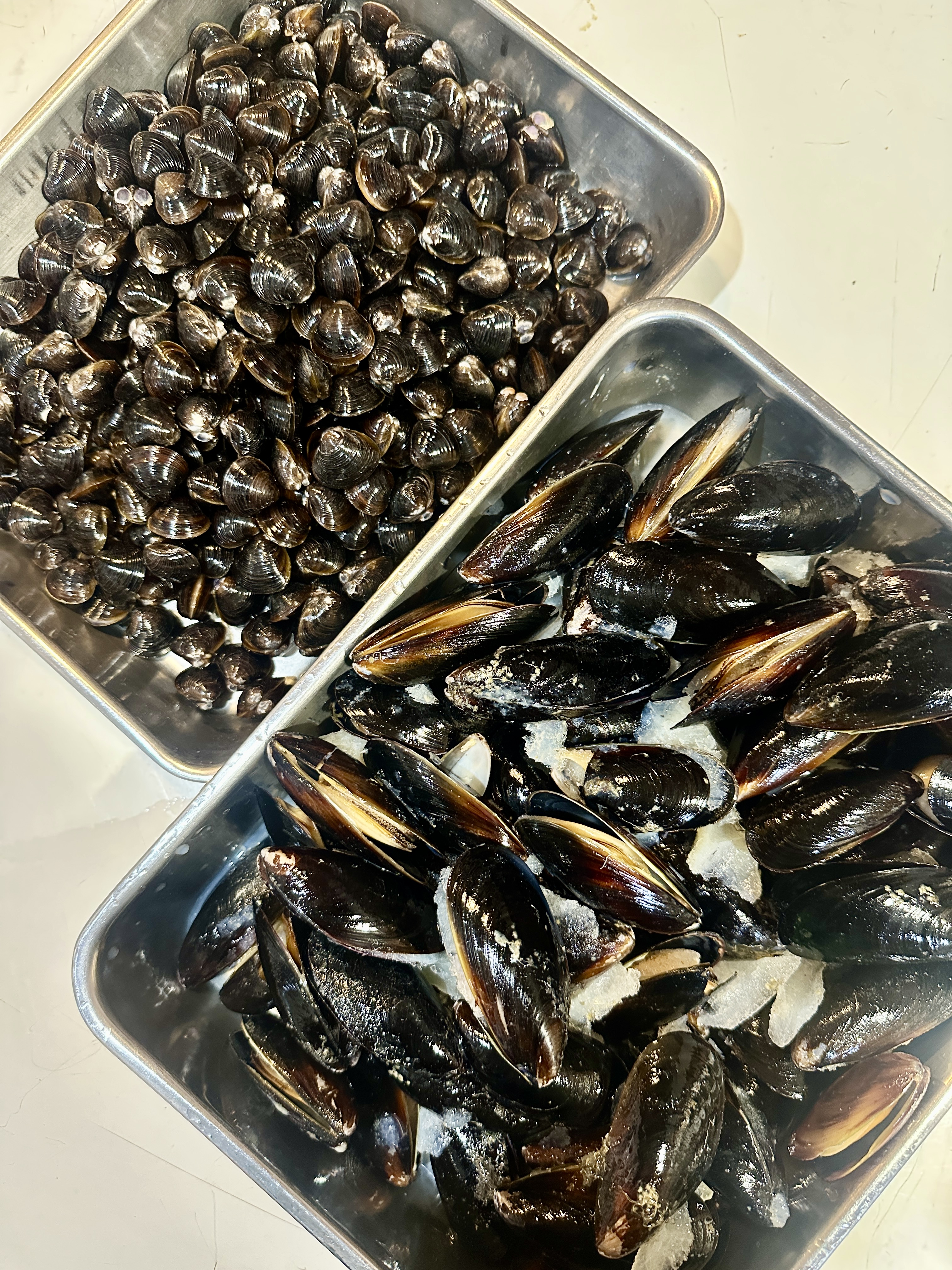 天然鮭(約70g)+ムール貝(1粒)+しじみ+ブーケガルニ+バジル+サフラン(少々)+昆布水