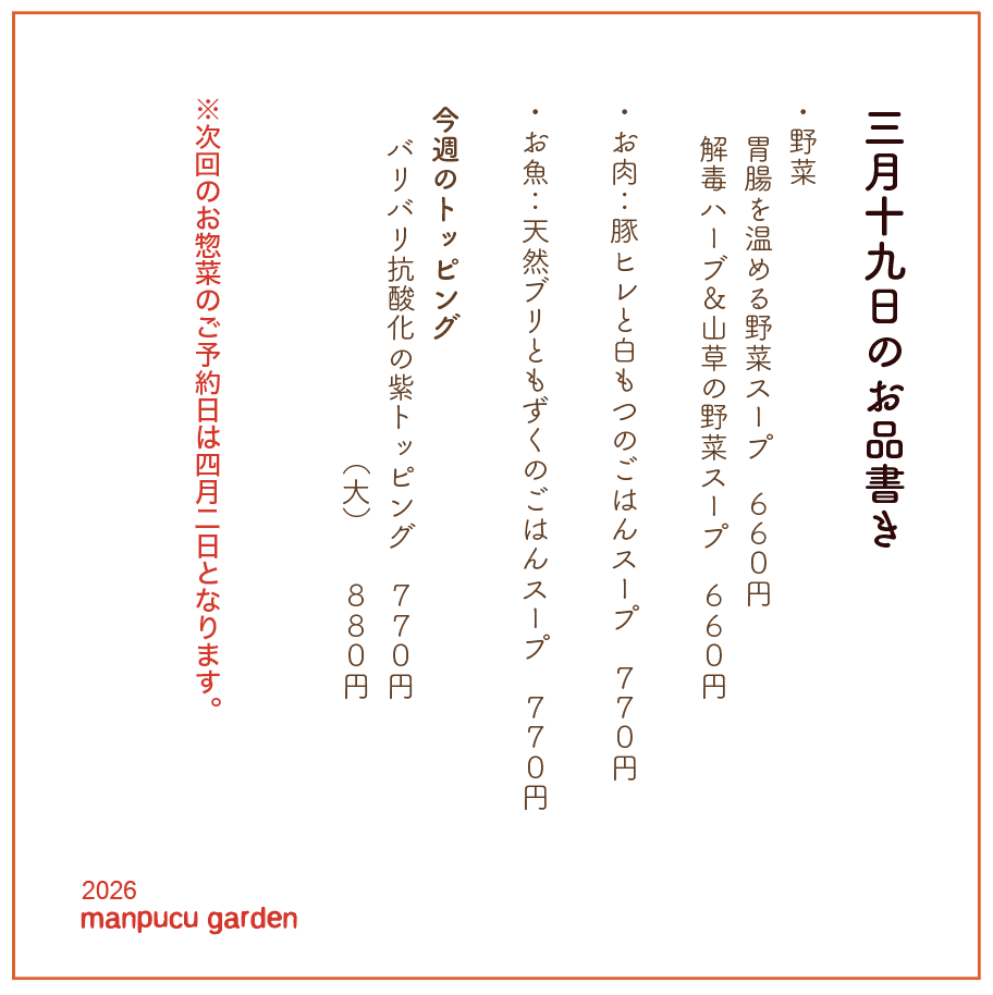 ご予約、お買い上げは オンラインストア(手作りお惣菜) からお願いいたします。