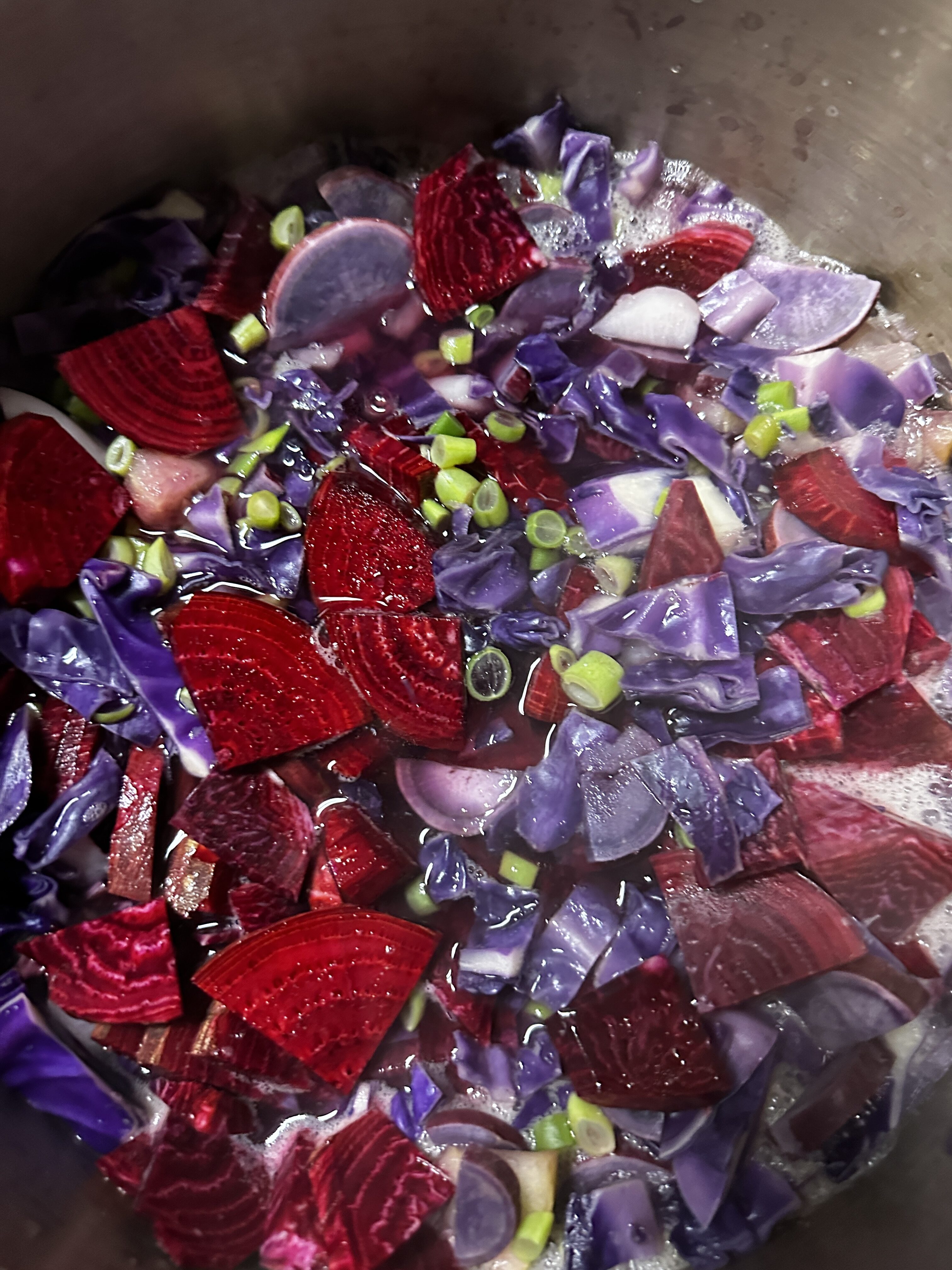紫さつまいも、紫キャベツ、ビーツ、大根、人参、セロリ、いんげん、椎茸、小豆煮、りんご、寒天